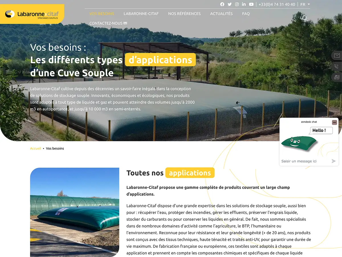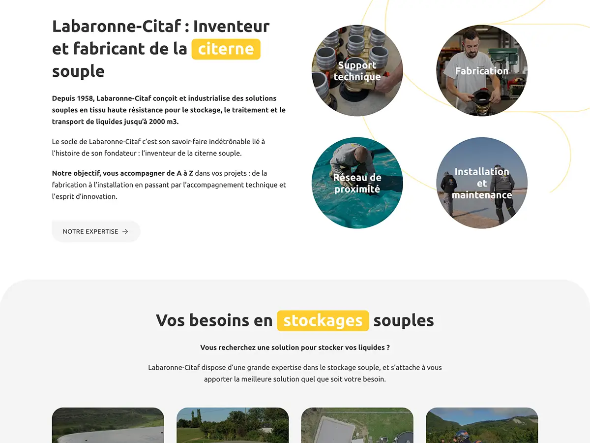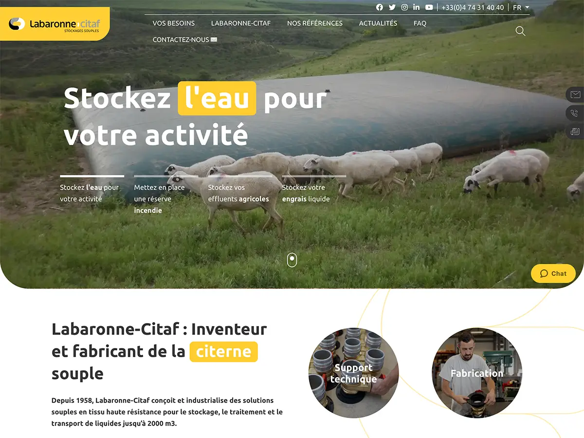 Le projet consistait à refondre le site web du fabricant français Labaronne Citaf, spécialisé depuis 1958 dans la conception et l’industrialisation de citernes souples haute résistance pour le stockage, traitement et transport de liquides. labaronne-citaf.fr L’enjeu était de donner une nouvelle dynamique à leur présence en ligne, de mettre en avant une vaste gamme de produits et d’applications (eau, effluents, gaz, etc…), et de proposer une expérience utilisateur moderne et fluide pour un public professionnel et international. Le site devait structurer l’accès aux solutions selon les besoins métiers et intégrer des dispositifs techniques tels que un multi-langue, des témoignages vidéos, et une liaison API CRM afin de renforcer le pilotage commercial. La collaboration avec l’agence Spritz a permis de traduire ces ambitions en un site sur mesure, performant et évolutif.