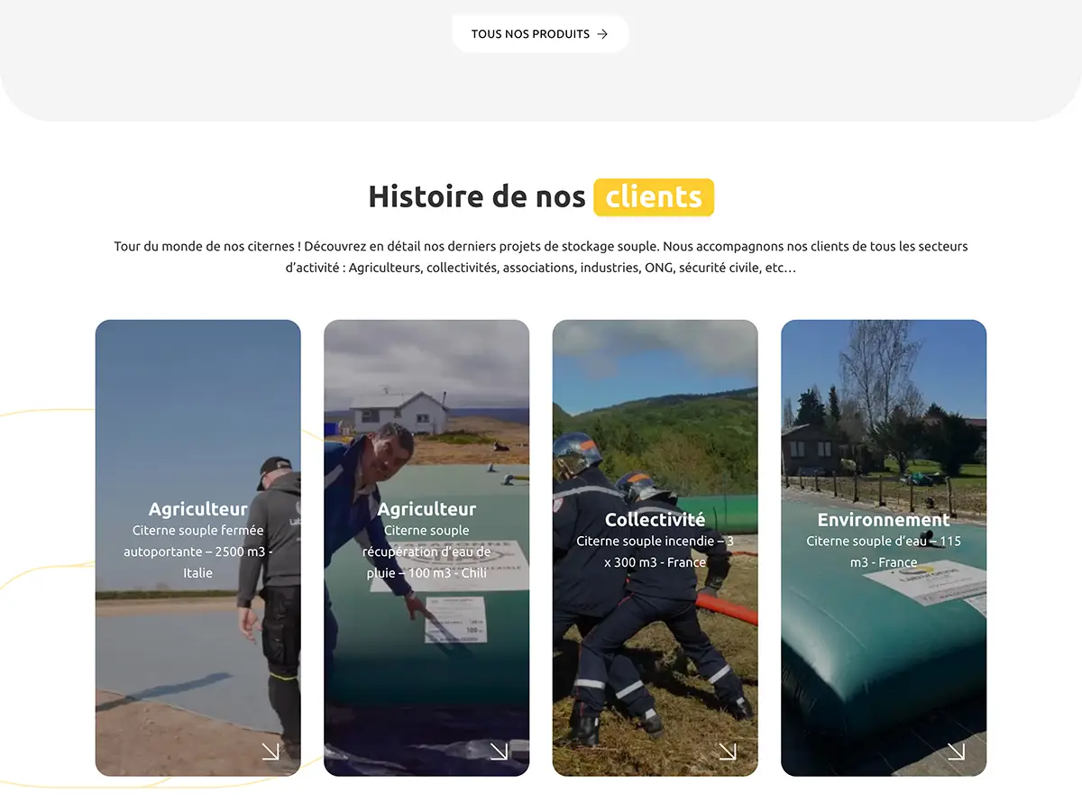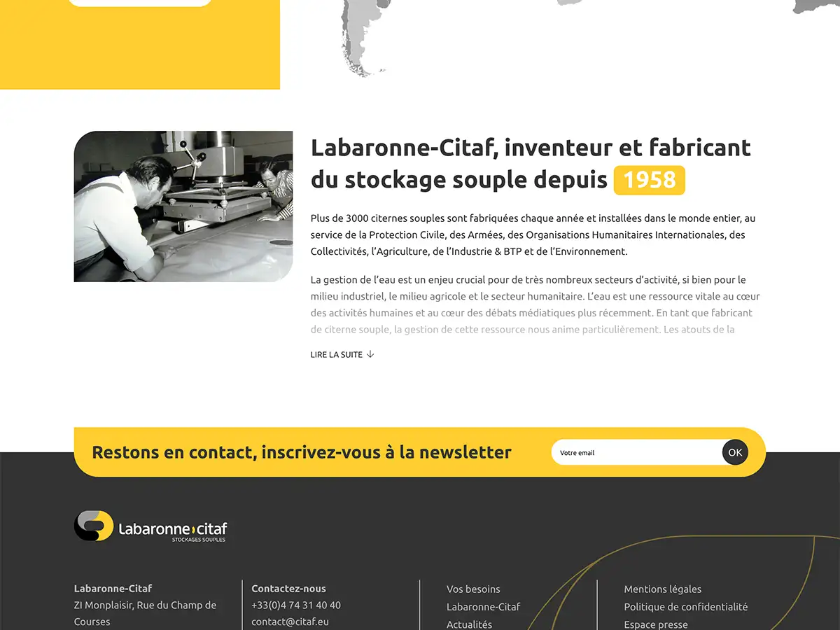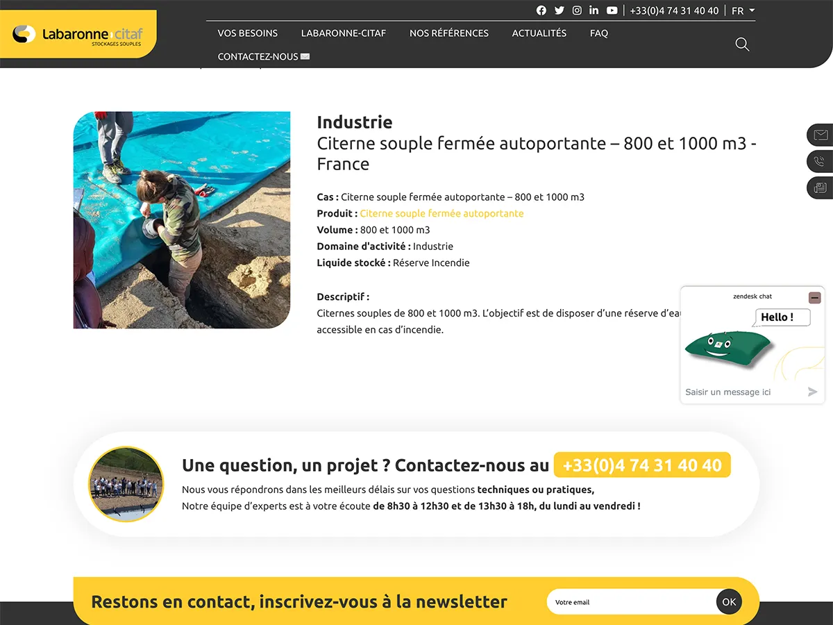 Le projet consistait à refondre le site web du fabricant français Labaronne Citaf, spécialisé depuis 1958 dans la conception et l’industrialisation de citernes souples haute résistance pour le stockage, traitement et transport de liquides. labaronne-citaf.fr L’enjeu était de donner une nouvelle dynamique à leur présence en ligne, de mettre en avant une vaste gamme de produits et d’applications (eau, effluents, gaz, etc…), et de proposer une expérience utilisateur moderne et fluide pour un public professionnel et international. Le site devait structurer l’accès aux solutions selon les besoins métiers et intégrer des dispositifs techniques tels que un multi-langue, des témoignages vidéos, et une liaison API CRM afin de renforcer le pilotage commercial. La collaboration avec l’agence Spritz a permis de traduire ces ambitions en un site sur mesure, performant et évolutif.
