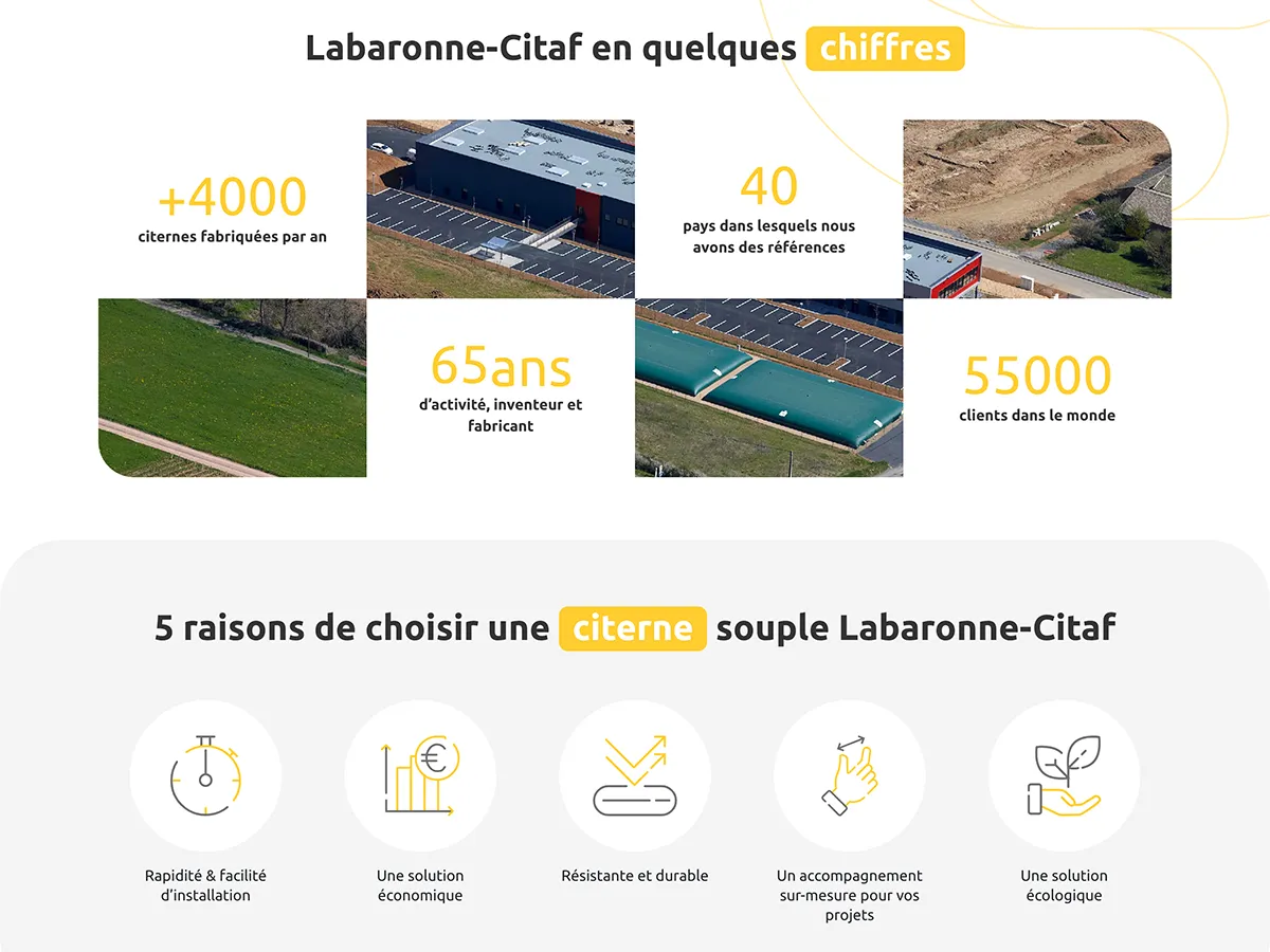 La société Labaronne Citaf est un fabricant français de citernes souples, fondée sur l’inventivité de son fondateur et un savoir-faire industriel de longue date. Située à Pont-Évêque (Isère), elle rayonne à l’international avec plus de 40 pays couverts et plus de 55 000 clients dans le monde. Elle conçoit des solutions sur mesure pour différents secteurs : agriculture, collectivités, industrie, sécurité civile. Son positionnement repose sur la fiabilité, la durabilité, et l’adaptabilité de ses équipements, combinées à un accompagnement technique complet.