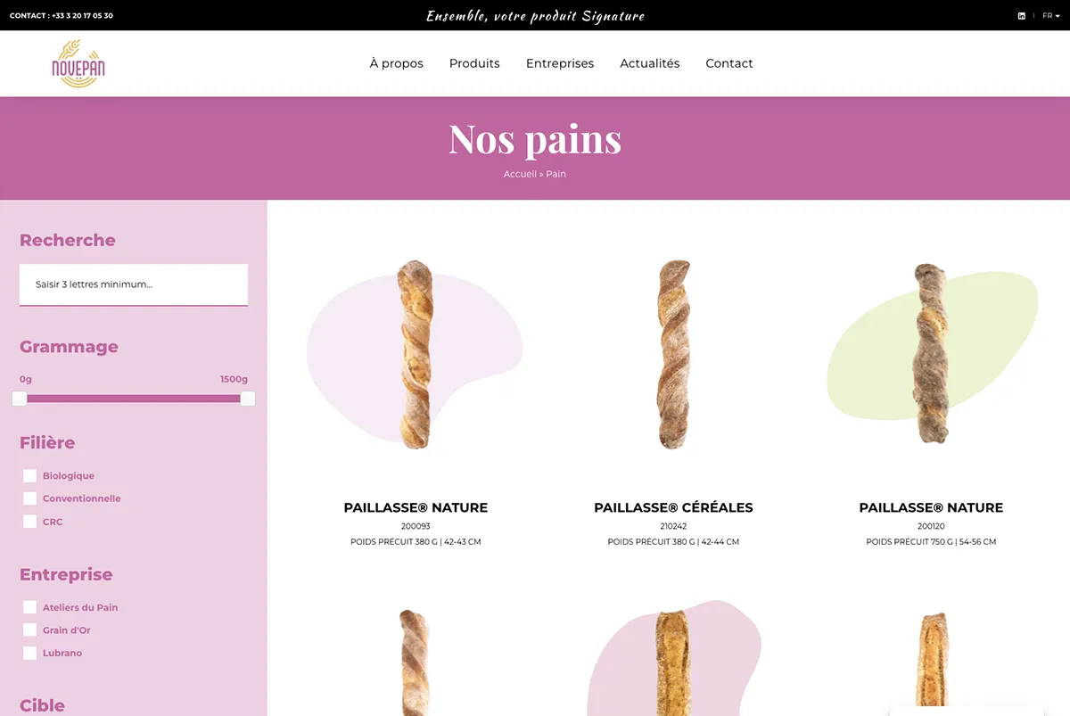 Dans le domaine compétitif de l'agroalimentaire, Novepan, spécialiste des produits céréaliers, a choisi de rafraîchir son image en ligne. L'entreprise souhaitait un site qui non seulement valorise son large catalogue de produits mais intègre également des outils modernes pour mieux interagir avec leurs clients. Spritz, agence web basée près de Lille, a relevé ce défi en offrant une plateforme dynamique, multilingue, et riche en fonctionnalités sur mesure pour renforcer le positionnement de Novepan sur le marché.